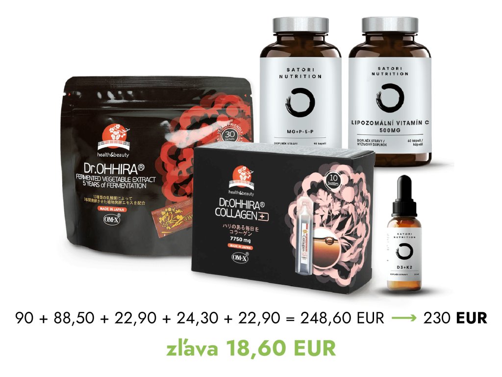Zima predstavuje pre našu pokožku náročné obdobie – chlad, suchý vzduch z vykurovania aj menší prísun slnečného svetla môžu spôsobovať jej dehydratáciu, stratu pružnosti a unavený vzhľad. Preto sme si pre vás pripravili zvýhodnený balíček Krása+ so zľavou 18,60 EUR, ktorý kombinuje päť prémiových doplnkov pre komplexnú starostlivosť o pleť, vlasy, nechty aj celkovú vitalitu. Spojenie OM-X® kolagénového nápoja Dr. Ohhira®, fermentovaného prebiotického extraktu, lipozomálneho vitamínu C, vitamínu D3 + K2 v MCT oleji a horčíka bisglycinátu pomáha regenerovať pleť zvnútra, posilňuje imunitu a navracia telu energiu v období, keď ju najviac potrebuje. Balíček Krása+ je ideálny pre tých, ktorí chcú starať sa o krásu zvnútra, dodať telu potrebné živiny pre pružnú a hydratovanú pleť, silné vlasy a nechty, a zároveň podporiť vnútornú rovnováhu a imunitu v zimných mesiacoch.