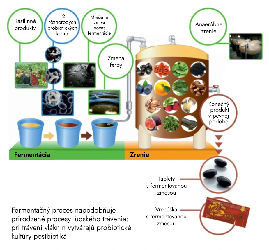 Na konci fermentácie tak získame výslednú zmes, akúsi jemnú, hustú pastu, špičkový zdroj probiotík. Zmes navyše vyniká tým, že je veľmi šetrná k tráviacemu traktu a ľahko stráviteľná (práve vďaka forme jemnej pasty), čo býva pri prebiotikách často problém. V tejto zmesi sa počas procesu tiež vystriedalo niekoľko generácií obrovského množstva baktérií, niekoľko rokov sa tak v zmesi vo veľkom množstve vytvárali cenné metabolity a tým sa z pasty stal aj bohatý zdroj postbiotík.